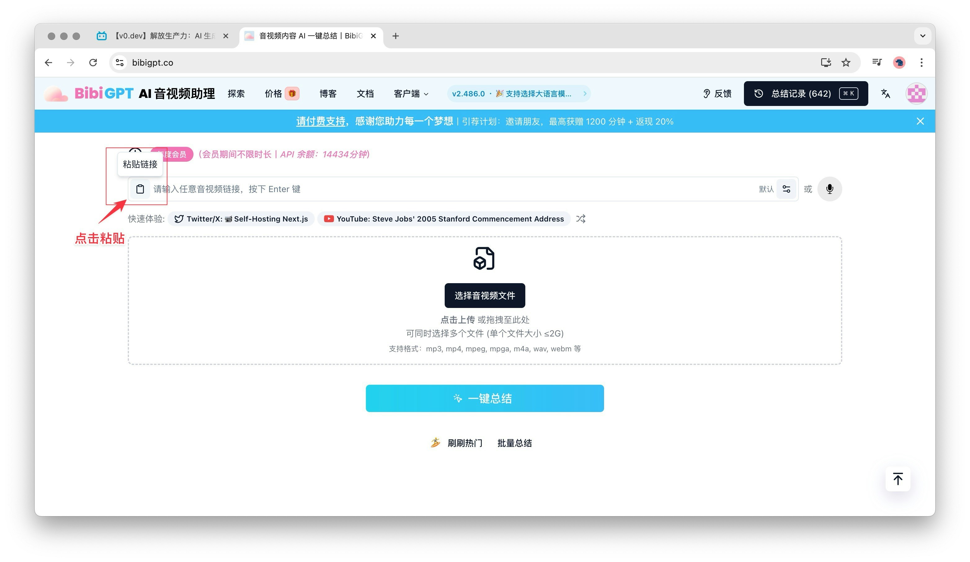 - 在BibiGPT中粘贴链接,点击粘贴链接按钮