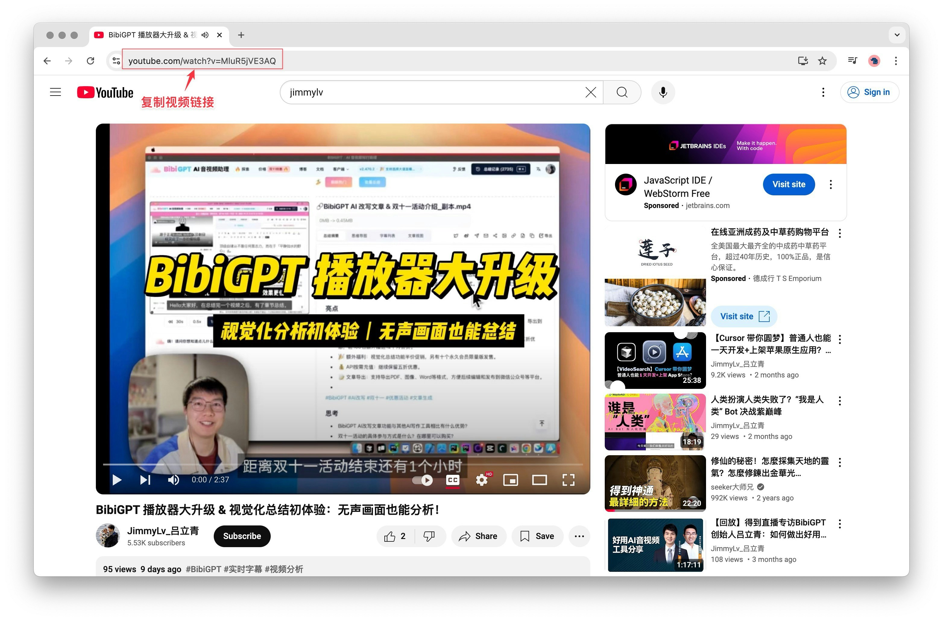 BibiGPT同样支持YouTube视频的总结,操作步骤如下:- 在YouTube视频页面复制视频URL