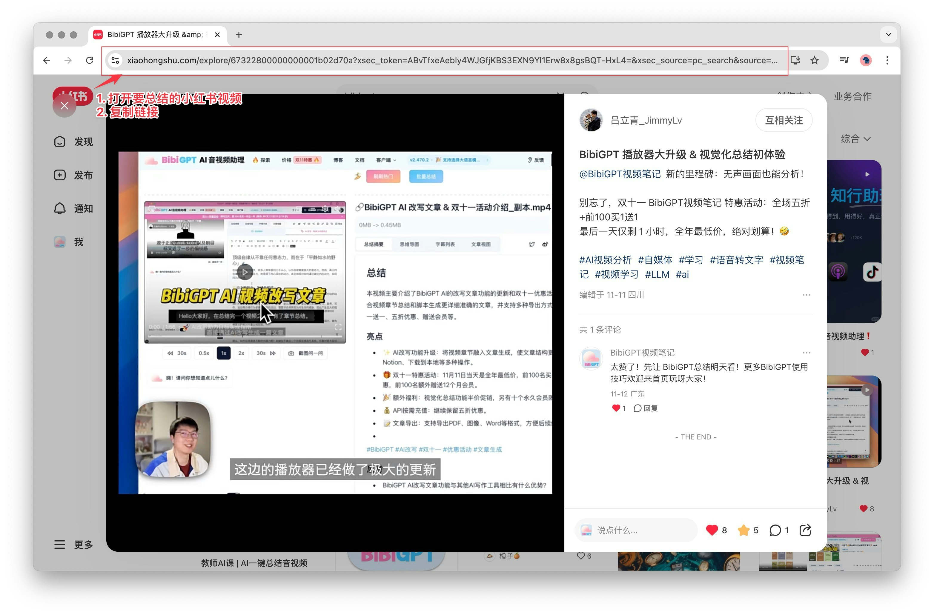 虽然小红书主要以图文为主,但BibiGPT也能处理小红书中的视频内容:- 在小红书App中找到想要总结的视频笔记,复制浏览器地址栏中的视频链接