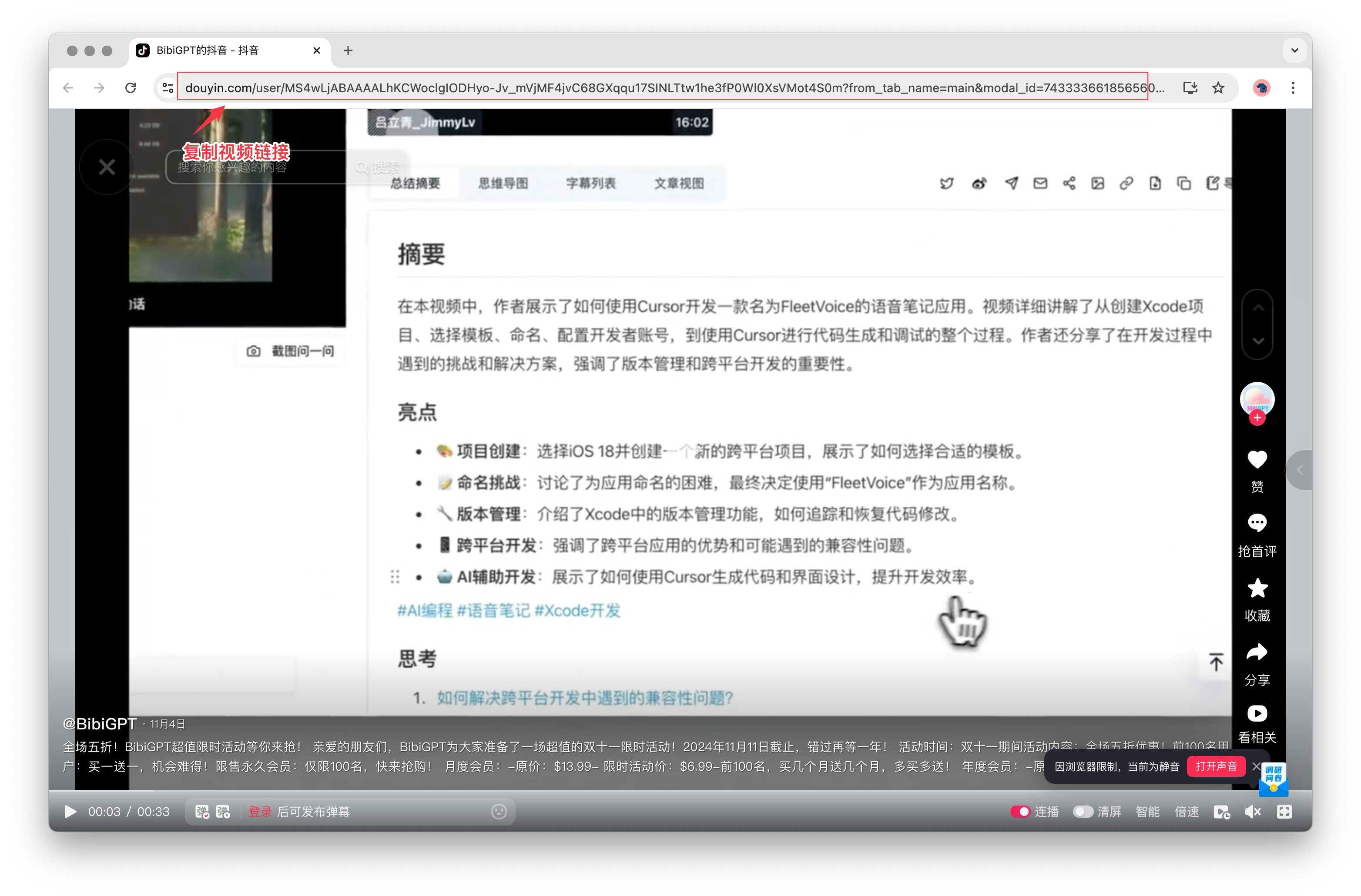 对于抖音平台的短视频内容,BibiGPT也能轻松处理:- 在抖音网站中找到想要总结的视频,复制浏览器地址栏中的视频链接